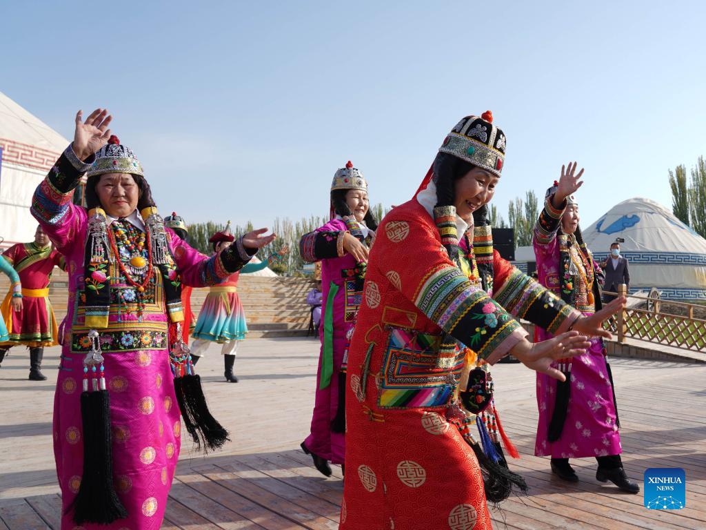Intangible cultural heritage inheritors dance with tourists at a scenic area of Bosten Lake in Bohu County, northwest China's Xinjiang Uygur Autonomous Region, Sept. 23, 2021. (Xinhua/Zhang Xiaocheng)