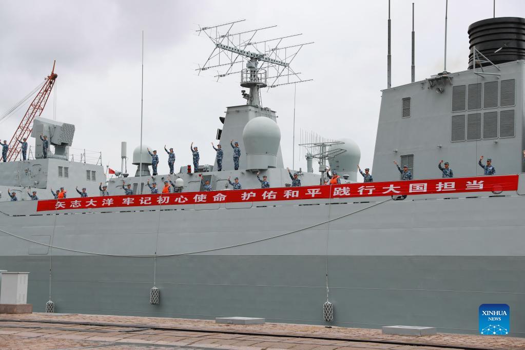 The 39th fleet of the Chinese People's Liberation Army (PLA) Navy sets out to conduct an escort mission in the Gulf of Aden and the waters off Somalia, at a port in Qingdao, east China's Shandong Province, Sept. 26, 2021. The fleet is composed of the guided-missile destroyer Urumqi, the missile frigate Yantai, and the supply ship Taihu, with dozens of special-operations soldiers and two helicopters on board. The PLA Navy began conducting escort missions in the Gulf of Aden and the waters off Somalia in December 2008. (Photo by Liu Zaiyao/Xinhua)