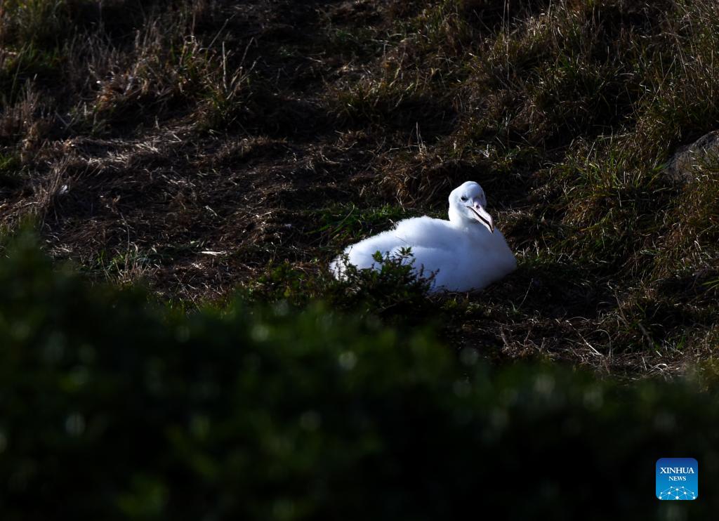 Photo taken on April 22, 2021 shows an albatross chick at Taiaroa Head, eco-sanctuary for Northern Royal Albatross situated in South Island of New Zealand. A record number of 30 fledglings of Northern Royal Albatrosses may leave the colony after a successful breeding season in the eco-sanctuary of Taiaroa Head in Southern New Zealand, according to New Zealand Department of Conservation figures released on Sept. 25. (Xinhua/Guo Lei)