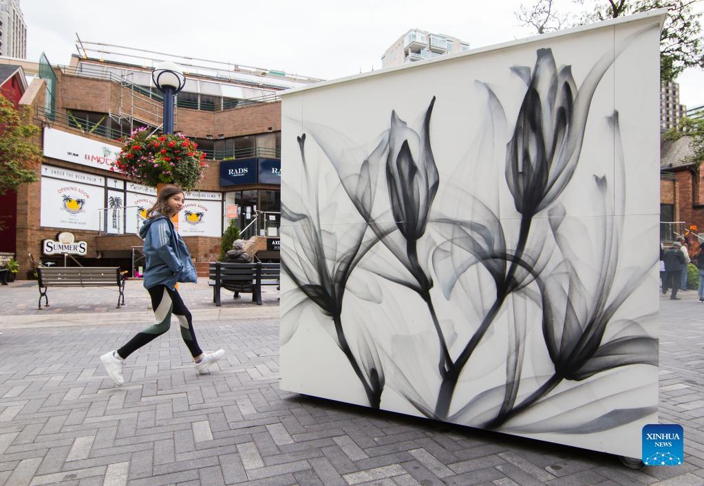 A girl walks past a mural during the 2021 Yorkville Murals art festival in Toronto, Canada, on Sept. 26, 2021. (Photo by Zou Zheng/Xinhua)