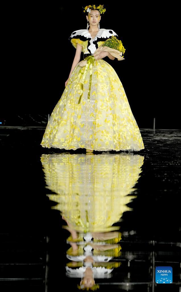 A model presents a creation designed by Laurence Xu during the Beijing Fashion Week in Beijing, capital of China, Sept. 26, 2021. The fashion event closed on Sept. 26. (Xinhua/Chen Jianli)