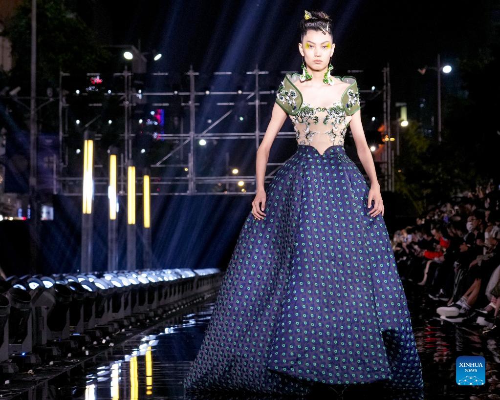 A model presents a creation designed by Laurence Xu during the Beijing Fashion Week in Beijing, capital of China, Sept. 26, 2021. The fashion event closed on Sept. 26. (Xinhua/Chen Jianli)