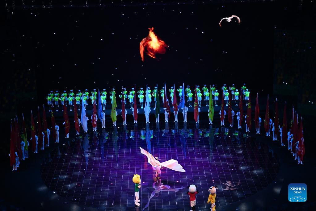 Photo taken on Sept. 27, 2021 shows the flame in the cauldron is extinguishing at the closing ceremony for China's 14th National Games in Xi'an of northwest China's Shaanxi Province. (Xinhua/Liu Xiao)
