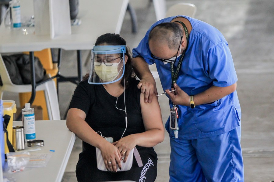 A healthcare worker receives a dose of China's Sinovac COVID-19 vaccine at the Marikina Sports Center in Marikina City, the Philippines, March 2, 2021. (Xinhua/Rouelle Umali)
