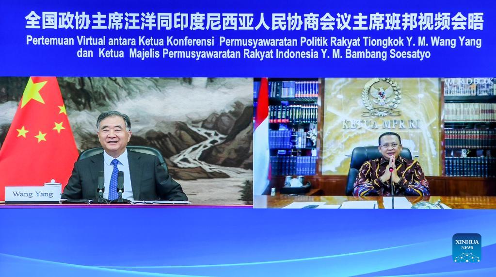 Wang Yang, a member of the Standing Committee of the Political Bureau of the Communist Party of China (CPC) Central Committee and chairman of the Chinese People's Political Consultative Conference (CPPCC) National Committee, meets Chairman of the Indonesian People's Consultative Assembly Bambang Soesatyo via video link in Beijing, capital of China, Sept. 27, 2021. (Xinhua/Rao Aimin)