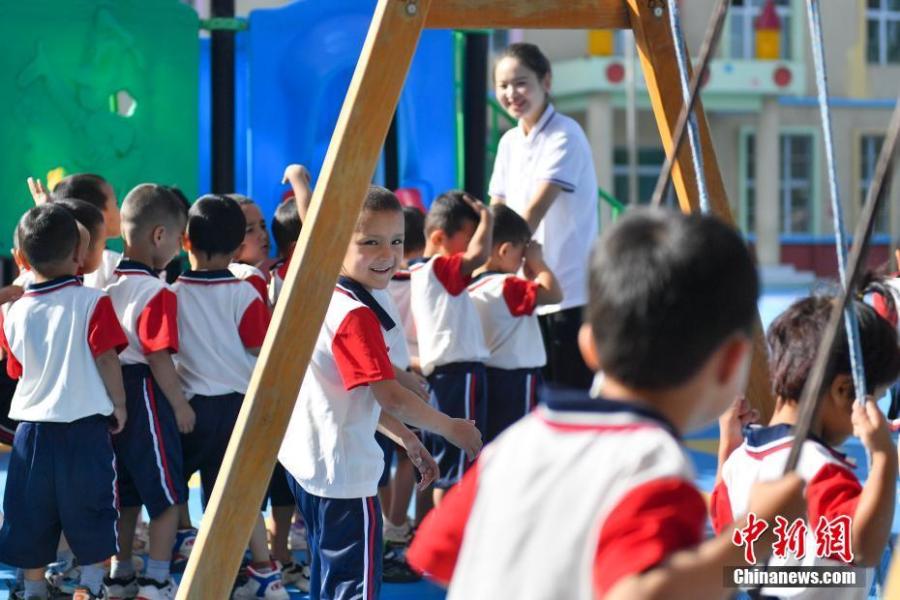 Children play games on the playground in Kumu village's kindergarten, Hotan County, China's Xinjiang Uygur Autonomous Region, Sept. 27, 2021. (China News Service/Tian Yuhao)