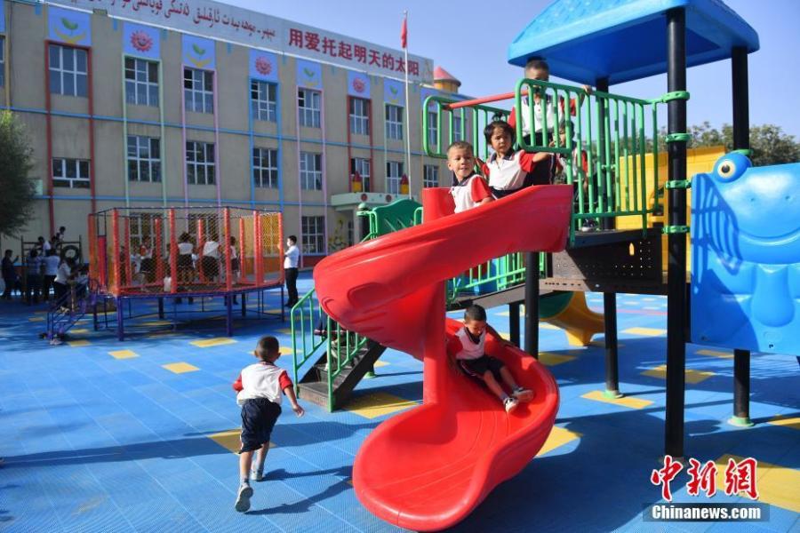 Children do activities on the playground in Kumu village's kindergarten, Hotan County, China's Xinjiang Uygur Autonomous Region, Sept. 27, 2021. (China News Service/Tian Yuhao)