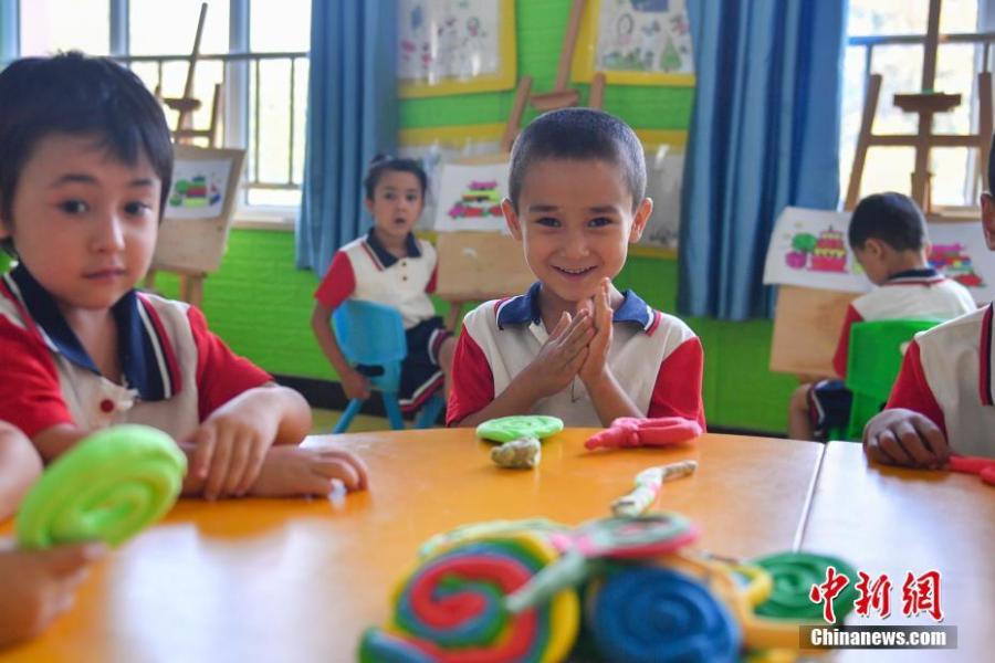 Children have a craft class in Kumu village's kindergarten, Hotan County, China's Xinjiang Uygur Autonomous Region, Sept. 27, 2021. (China News Service/Tian Yuhao)