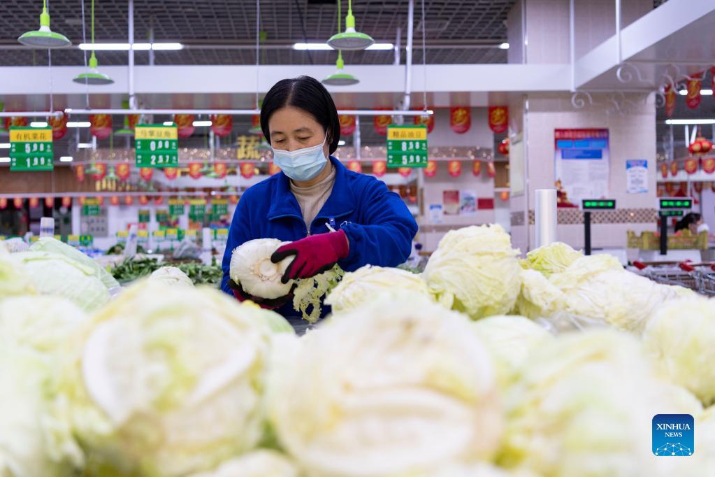 A supermarket employee prepares vegetables ordered online by residents under close-off management in Bayan County of Harbin, northeast China's Heilongjiang Province, Sept. 27, 2021. Local authorities have prioritized delivery services to ensure the supply of necessities for residents under close-off management. The pricing of commodities remains stable in the county. (Xinhua/Xie Jianfei)