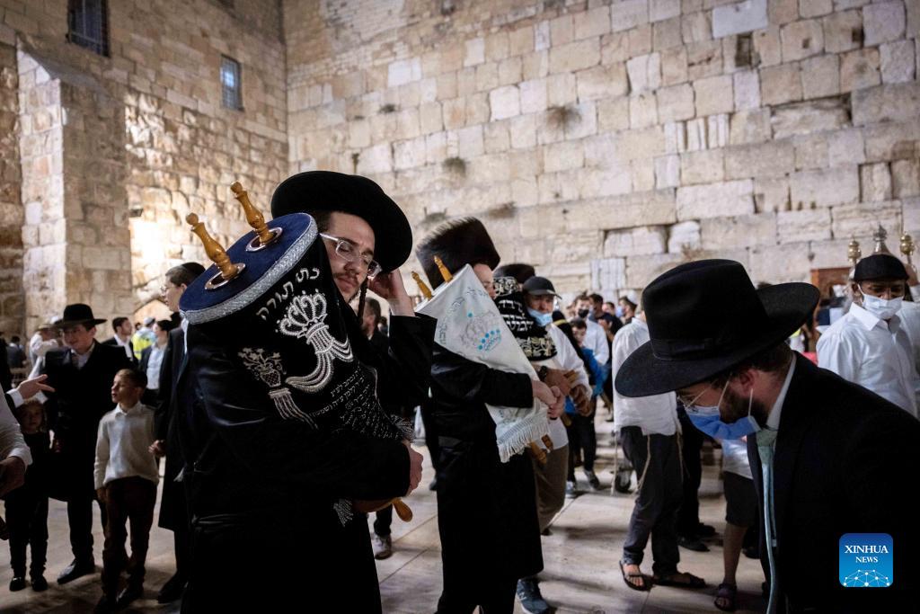 Jewish men carry Torah scrolls during Simchat Torah celebrations at the Western Wall in Jerusalem's Old City, on Sept. 28, 2021. (JINI via Xinhua)