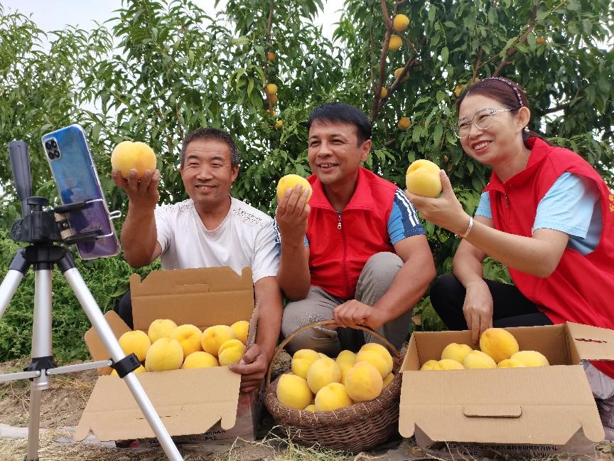 | Cadres dispatched to Gudao village, Shawan, Xinjiang Uygur autonomous region, joins a livestream marketing activity with local farmers, Sept. 1, 2021. (People's Daily Online/Lan Ling) |