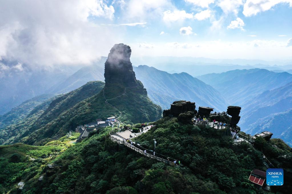 In this aerial photo, tourists visit Mount Fanjing in Tongren City, southwest China's Guizhou Province, Sept. 27, 2021. Boasting rich natural resources and high vegetation coverage, Mount Fanjing was listed as a UNESCO World Natural Heritage Site in 2018. (Xinhua/Yang Wenbin)