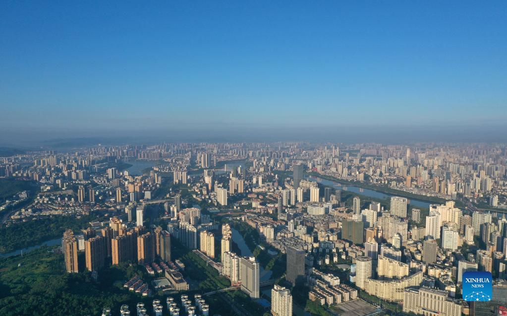 Aerial photo taken on Sept. 28, 2021 shows an early morning view of Nanning, capital of south China's Guangxi Zhuang Autonomous Region. (Xinhua/Huang Xiaobang)