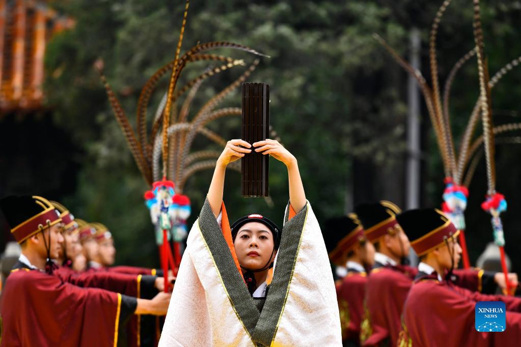 A ceremony marking the 2,572nd anniversary of the birth of ancient Chinese sage and educator Confucius is held at Confucius Temple in Qufu, east China's Shandong Province, Sept. 28, 2021. Born near the present-day town of Qufu, Confucius (551-479 B.C.) founded a school of thought that influenced later generations and became known as Confucianism. (Xinhua/Guo Xulei)