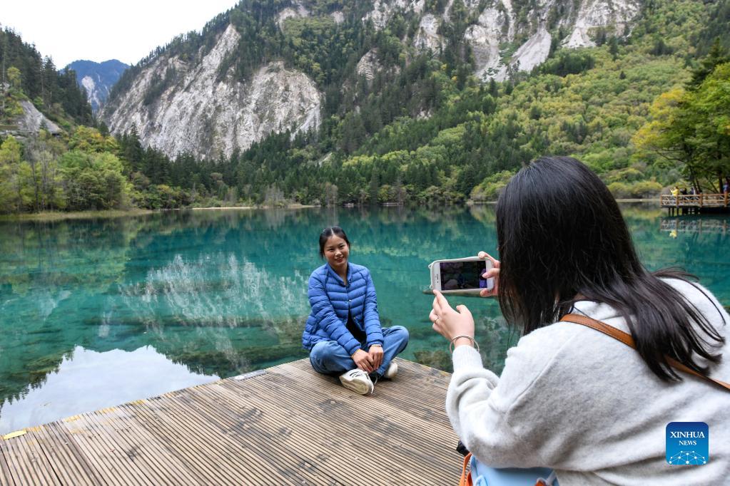 Tourists take photos at the Jiuzhaigou scenic spot in Jiuzhaigou County, southwest China's Sichuan Province, Sept. 27, 2021. Jiuzhaigou, a famous scenic spot in Sichuan Province, fully reopened to visitors on Tuesday. On Aug. 8, 2017, a 7.0-magnitude quake forced the closure of the Jiuzhaigou National Park, a UNESCO World Heritage site famous for its spectacular waterfalls, lush forests, and serene plateau lakes. More than 270,000 trees have been planted over the past three years, and 172 hectares of ecological habitat repaired and restored in Jiuzhaigou. The damaged mountains and vegetation have also rapidly recovered. The ecosystem was effectively restored. (Xinhua/Tang Wenhao)