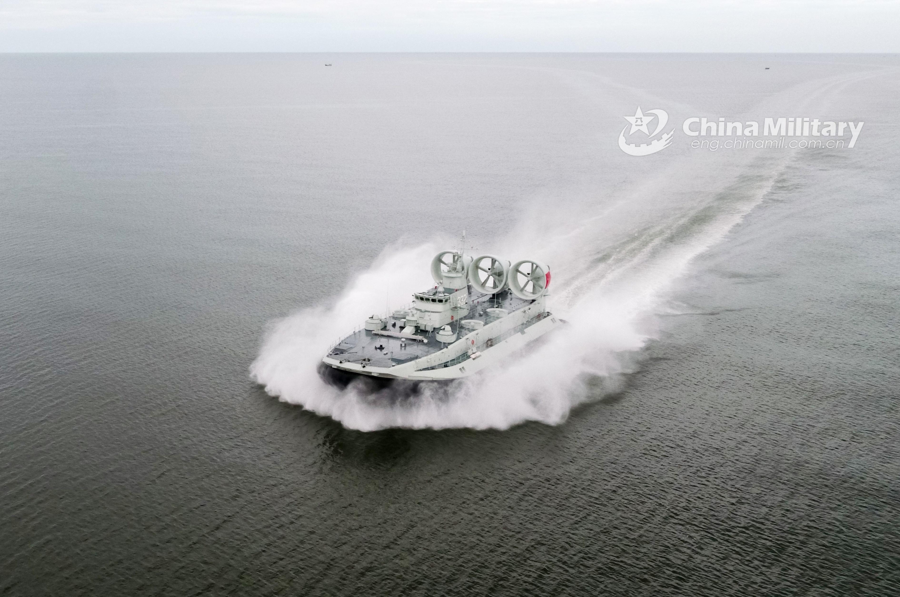 An air-cushioned landing craft attached to a naval landing ship flotilla under the PLA Southern Theater Command maneuvers at high speed during a realistic combat training exercise on September 16, 2021. (eng.chinamil.com.cn/Photo by Li Jia)