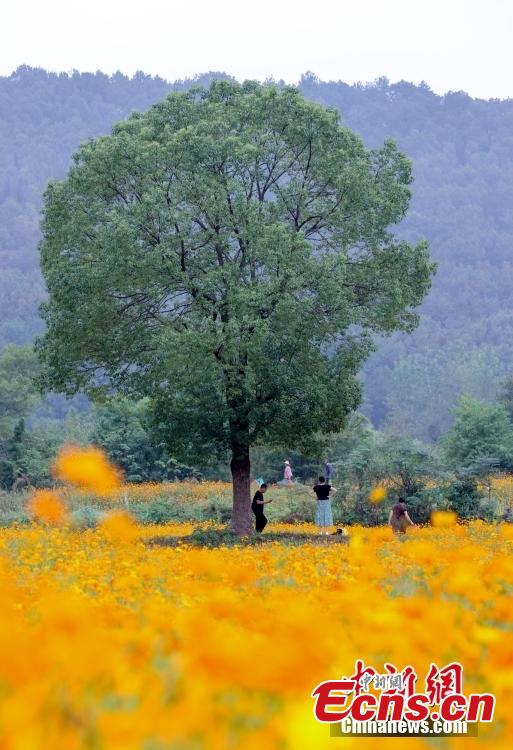 Tourists immerse themselves into a 14-hectare field of orange and yellow cosmos flowers(cosmos sulphureus) in the Optics Valley Ecological Corridor in Wuhan, capital of central China's Hubei Province, Sept. 29, 2021. (China News Service/Zhang Chang)