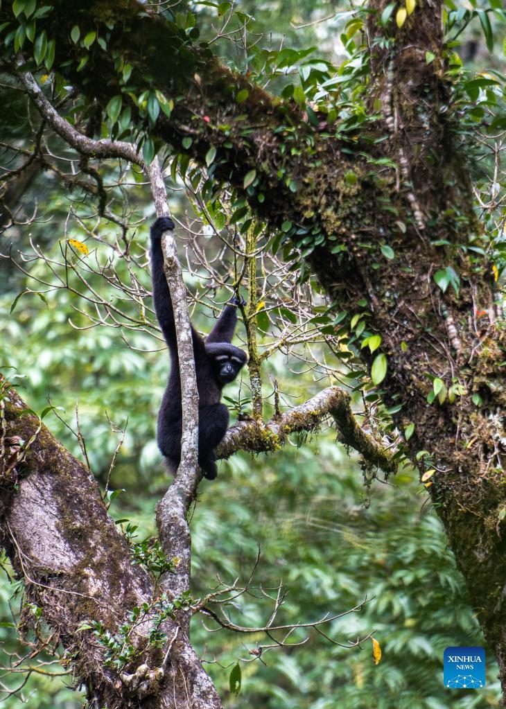 A skywalker gibbon is seen at the Gaoligong Mountain, Baoshan City, southwest China's Yunnan Province, Sept. 28, 2021. Skywalker gibbon, a typical arboreal animal, is one of the national key protected wild animals, mainly found in Gaoligong Mountain. (Xinhua/Wang Guansen)