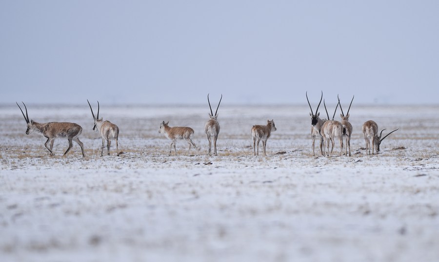 Photo taken on April 20, 2021 shows Tibetan antelopes in Hoh Xil, northwest China's Qinghai Province. (Xinhua/Wu Gang)