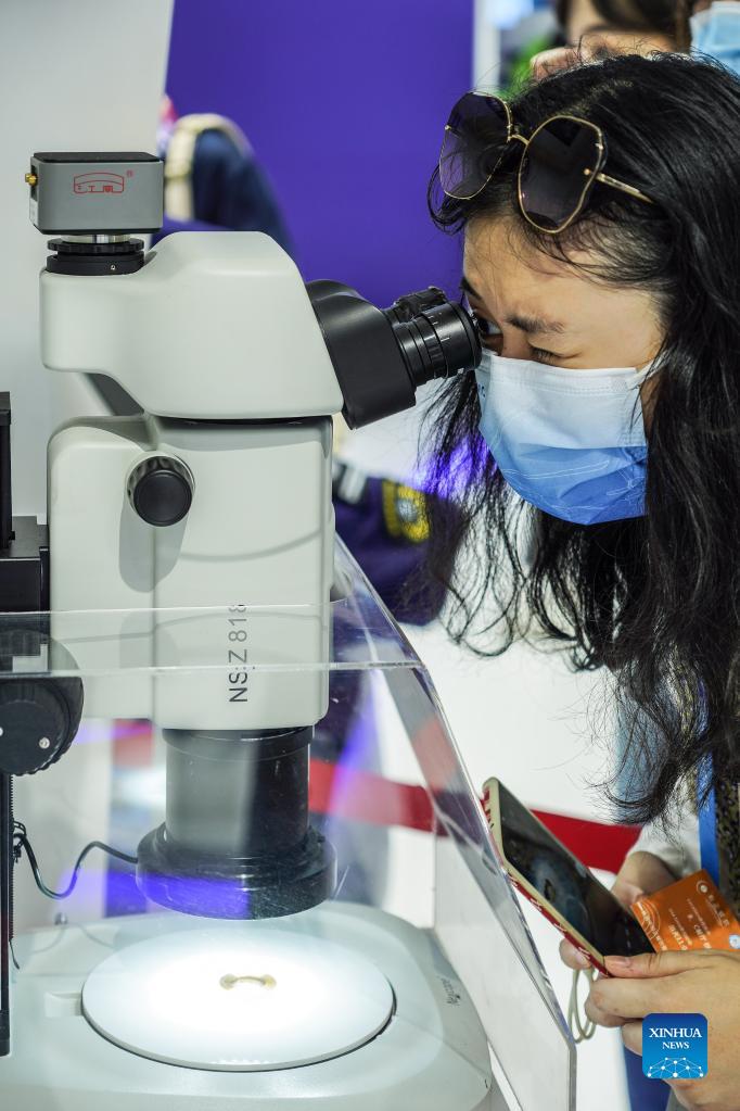 A visitor observes lunar samples brought back by China's Chang'e-5 lunar probe via a microscope during the 13th China International Aviation and Aerospace Exhibition, or Airshow China 2021, in Zhuhai, south China's Guangdong Province, Sept. 29, 2021. (Xinhua/Liu Dawei)