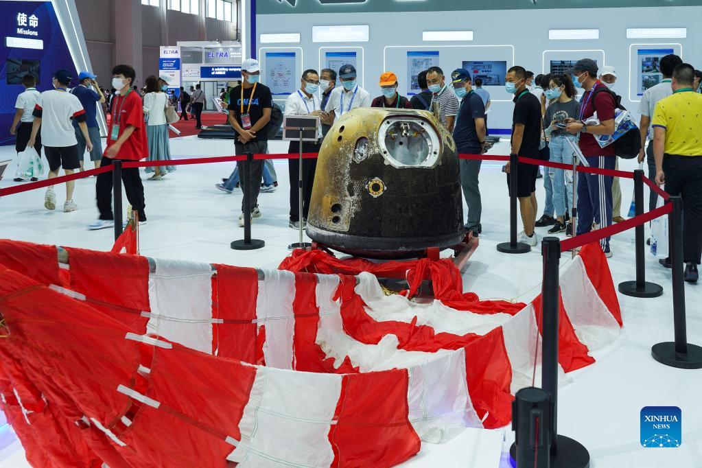 People look at the parachute and return capsule of the Chang'e-5 probe on display during the 13th China International Aviation and Aerospace Exhibition, or Airshow China 2021, in Zhuhai, south China's Guangdong Province, Sept. 29, 2021. (Xinhua/Liu Dawei)