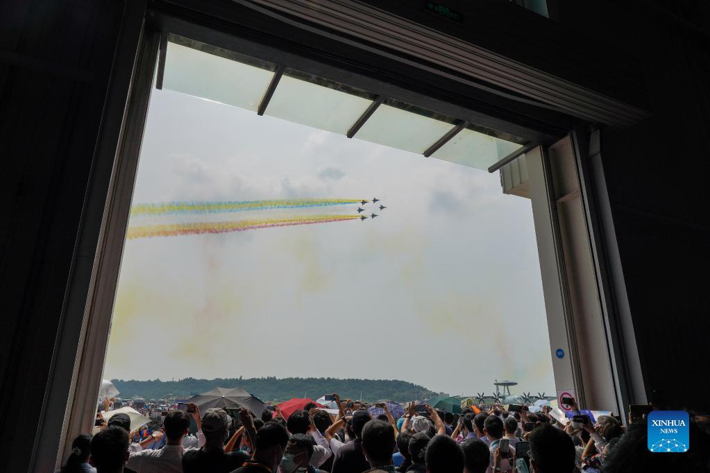 J-10 fighter jets of China's Bayi Aerobatic Team perform aerobatics during the 13th China International Aviation and Aerospace Exhibition, or Airshow China 2021, in Zhuhai, south China's Guangdong Province, Sept. 29, 2021. (Xinhua/Liu Dawei)