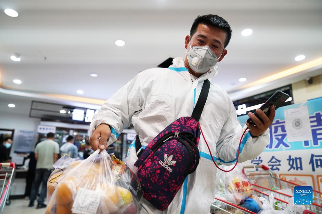 Deliveryman Li Yang picks packages at a supermarket in Bayan County of Harbin, northeast China's Heilongjiang Province, Sept. 27, 2021. Since the latest COVID-19 resurgence in Bayan County, local authorities have prioritized delivery services to ensure the supply of necessities. Couriers like Li Yang are working day and night to deliver food items and medical supplies to the residents under closed-off management. (Xinhua/Wang Jianwei)