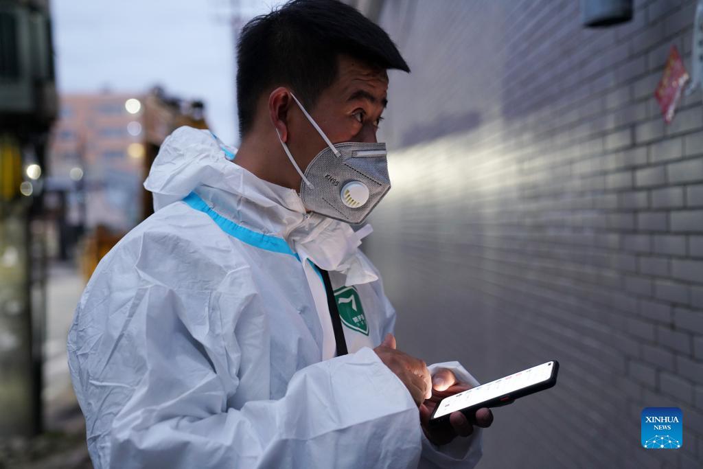 Deliveryman Li Yang checks online orders at a residential community in Bayan County of Harbin, northeast China's Heilongjiang Province, Sept. 26, 2021. Since the latest COVID-19 resurgence in Bayan County, local authorities have prioritized delivery services to ensure the supply of necessities. Couriers like Li Yang are working day and night to deliver food items and medical supplies to the residents under closed-off management. (Xinhua/Wang Jianwei)