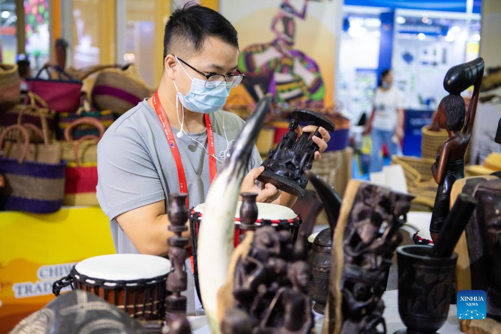 A visitor chooses products during the Second China-Africa Economic and Trade Expo in Changsha, capital of central China's Hunan Province, Sept. 29, 2021. The second China-Africa Economic and Trade Expo closed on Wednesday. The four-day event, held both online and offline and themed "New Start, New Opportunities, and New Accomplishments," attracted nearly 900 enterprises from nearly 40 African countries and China, according to the organizers. (Xinhua/Chen Sihan)