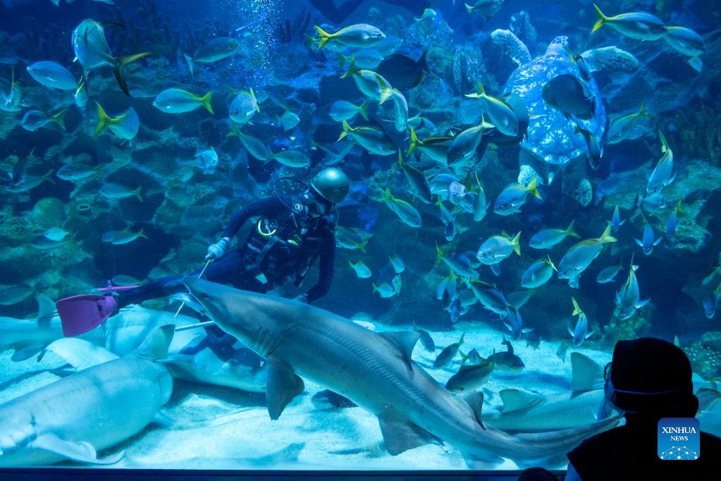 A diver feeds a shark at Aquaria KLCC in Kuala Lumpur, Malaysia, Sept. 29, 2021. Aquaria KLCC will be open for fully vaccinated visitors starting from Oct. 1. (Photo by Chong Voon Chung/Xinhua)