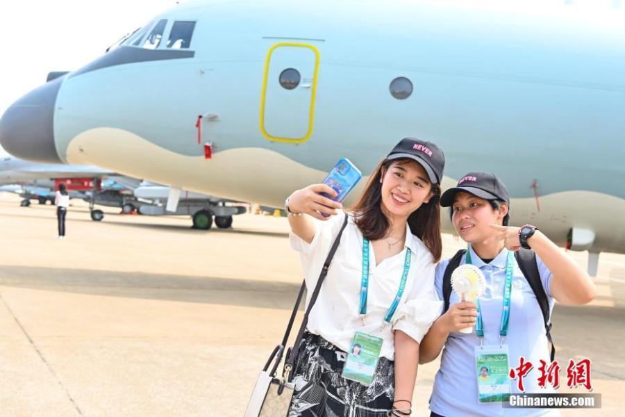 Members of teenage team from Hong Kong and Macao take selfies against the backdrop of a KJ-500 airborne early warning (AEW) aircraft during the 13th China International Aviation and Aerospace Exhibition in the southern Chinese city of Zhuhai, Guangdong Province, Sept. 29, 2021. (China News Service/Chen Jimin)