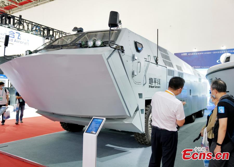 An amphibious transport vehicle "Horizon" is showcased during the 13th China International Aviation and Aerospace Exhibition in the southern Chinese city of Zhuhai, Guangdong Province, Sept. 29, 2021. (China News Service/Chen Jimin)