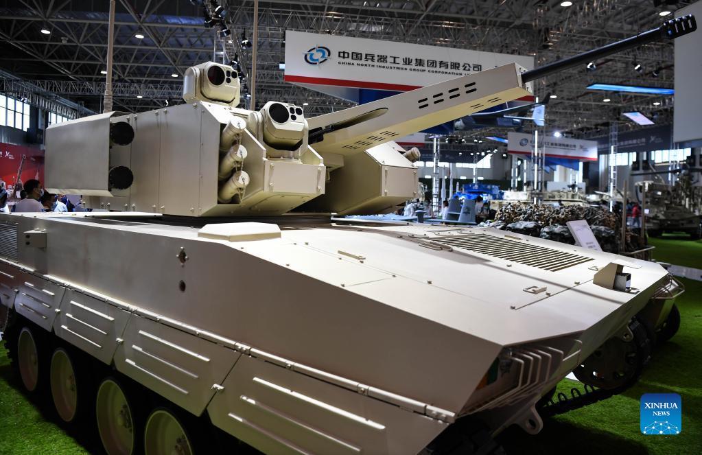 Photo taken on Sept. 29, 2021 shows a ground unmanned combat platform displayed at the 13th China International Aviation and Aerospace Exhibition, or Airshow China 2021, in Zhuhai, south China's Guangdong Province. (Xinhua/Deng Hua)