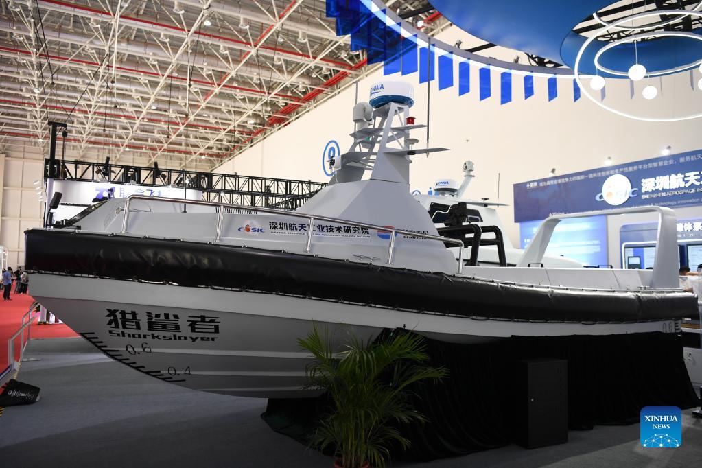 Photo taken on Sept. 29, 2021 shows an unmanned patrol boat displayed at the 13th China International Aviation and Aerospace Exhibition, or Airshow China 2021, in Zhuhai, south China's Guangdong Province. (Xinhua/Deng Hua)