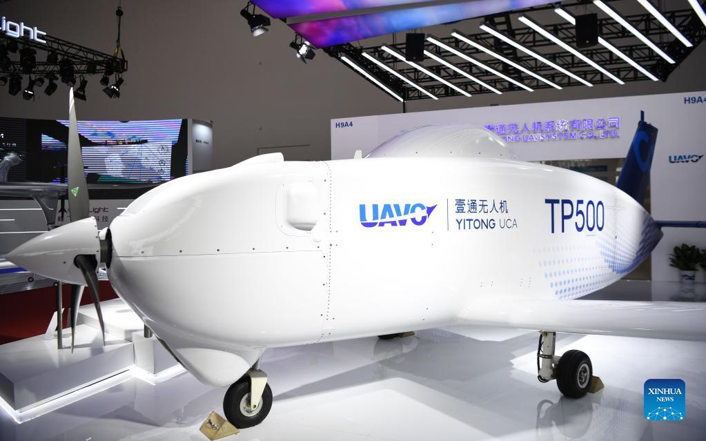 Photo taken on Sept. 29, 2021 shows an unmanned aerial vehicle (UAV) displayed at the 13th China International Aviation and Aerospace Exhibition, or Airshow China 2021, in Zhuhai, south China's Guangdong Province. (Xinhua/Deng Hua)