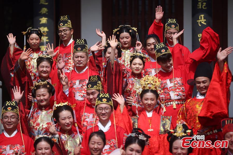 Newlyweds dressed in traditional Han costumes (Hanfu) attend a group wedding ceremony at a historical and cultural park in Xuzhou City, east China's Jiangsu Province, Sept. 29, 2021. (China News Service/Yang Bo)