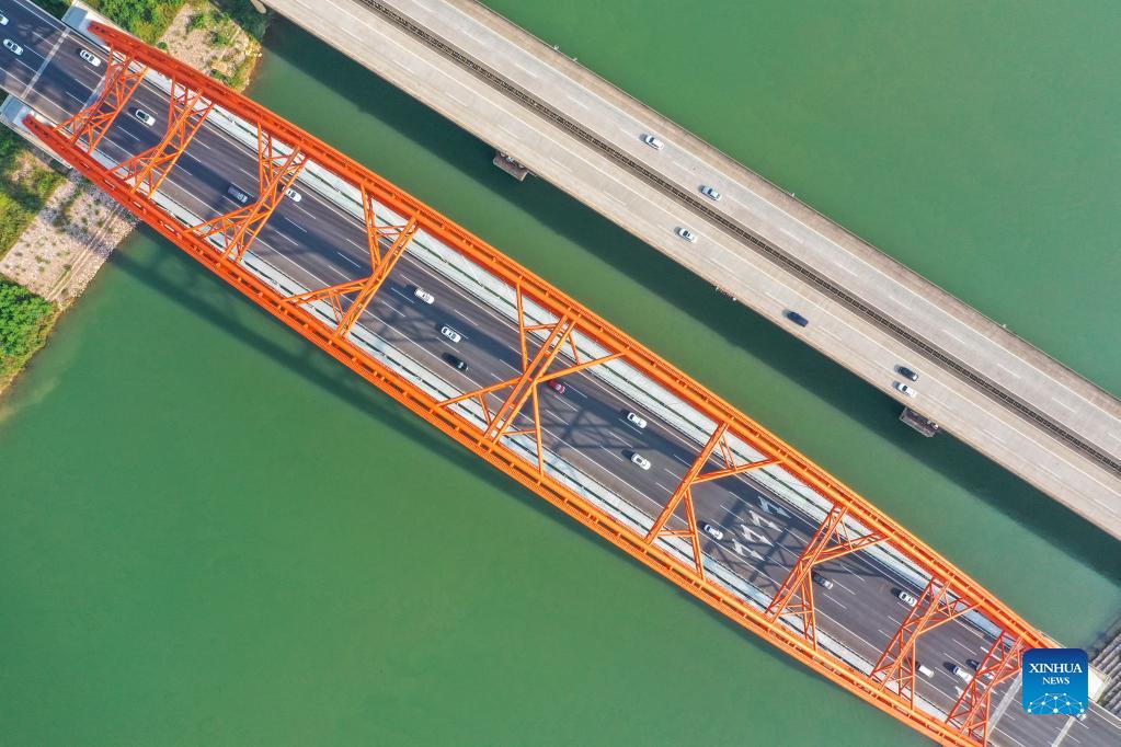 Aerial photo taken on Oct. 1, 2021 shows vehicles running on a bridge on the outskirts of Nanning, south China's Guangxi Zhuang Autonomous Region. (Xinhua/Cao Yiming)