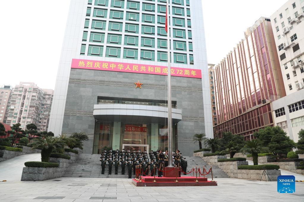 The Chinese People's Liberation Army (PLA) Garrison in the Macao Special Administrative Region holds a flag-raising ceremony to celebrate the 72nd anniversary of the founding of the People's Republic of China in Macao, south China, Oct. 1, 2021. (Photo by Chen Shuai/Xinhua)