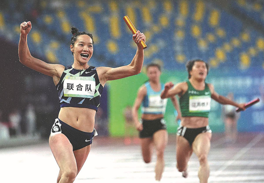 The united team's Wei Yongli celebrates winning the women's 4x100m relay on Sept 24. XINHUA