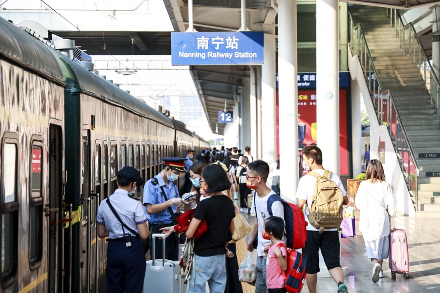 Passengers get tickets checked before boarding on a train at the Nanning Railway Station in Nanning, south China's Guangxi Zhuang Autonomous Region, Oct. 1, 2021. (Photo by Zhao Shilin/Xinhua)