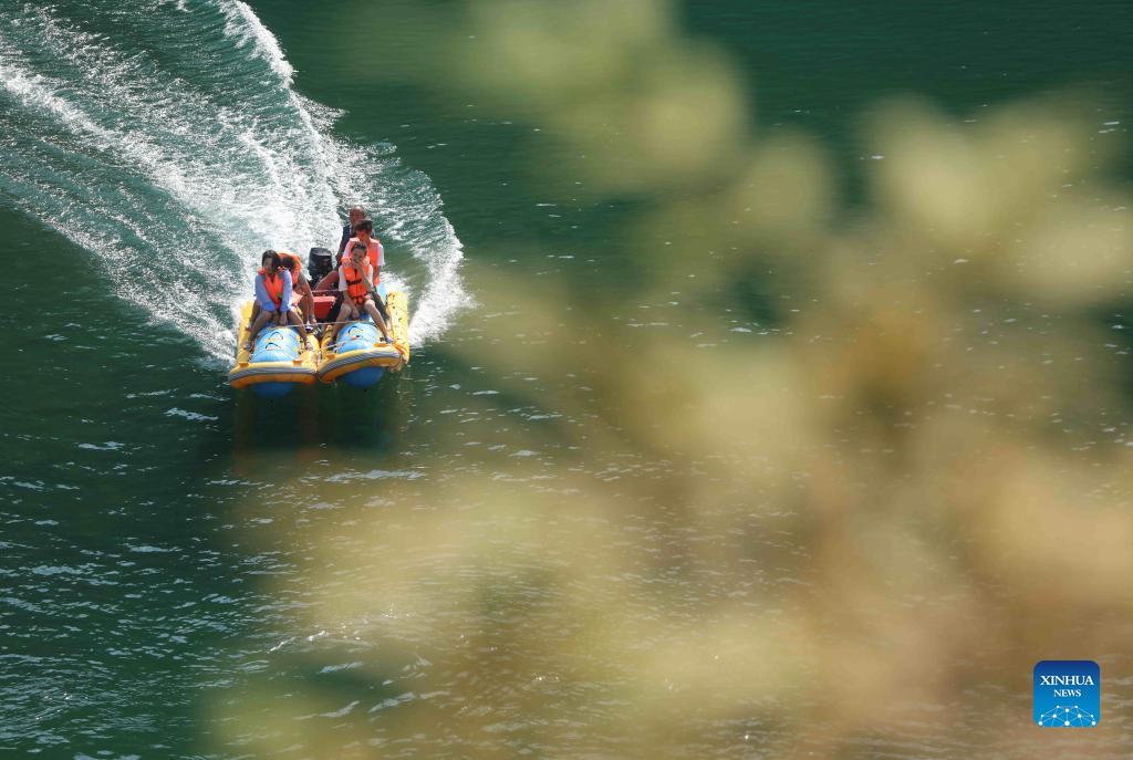 Tourists enjoy a raft ride at the Maoyan River scenic area during the ongoing National Day holiday in Zhangjiajie, central China's Hunan Province, Oct. 3, 2021. (Photo by Wu Yongbing/Xinhua)