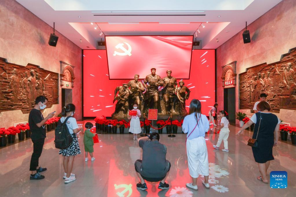 Tourists take photos at the memorial of the fourth National Congress of the Communist Party of China (CPC) in east China's Shanghai, Oct. 3, 2021. East China's Shanghai is home to many landmark sites which bear witness to the CPC history and the CPC revolutionary activities. As "red tourism" becomes increasingly popular, the city has launched a special hop-on hop-off bus service that provides more fun to travel between five notable "red sites" during the National Day holiday. (Xinhua/Wang Xiang)