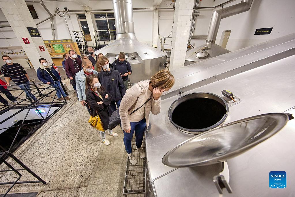 People visit the Ottakringer Brewery in Vienna, Austria, on Oct. 2, 2021. The Ottakringer Brewery was transformed into a museum for one night to greet visitors as part of the Long Night of Museums on Saturday. Around 640 museums, galleries, and cultural institutions presented their collections and exhibitions during the Long Night of Museums. (Photo by Georges Schneider/Xinhua)