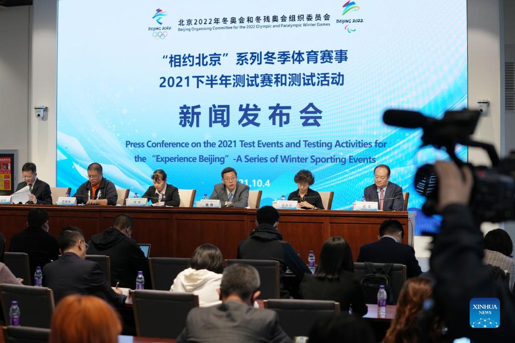 Photo taken on Oct. 4, 2021 shows the press conference on the 2021 test events and testing activities for the "Experience Beijing", a series of winter sporting events, held in Beijing, China. (Xinhua/Ju Huanzong)