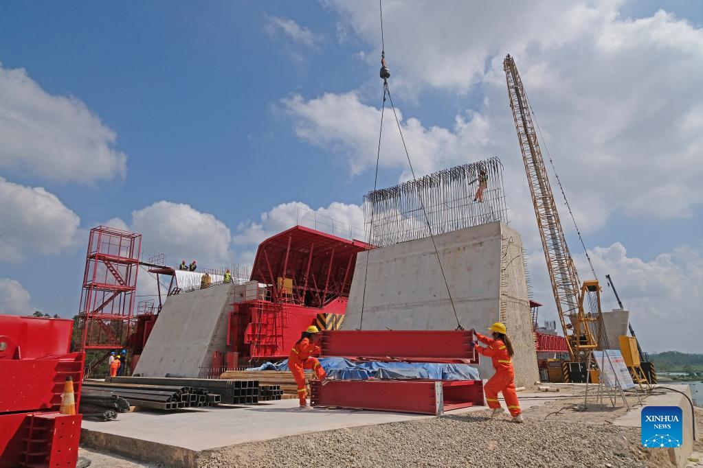 Aerial photo taken on Oct. 4, 2021 shows the construction site of the Longmen Bridge in Qinzhou City, south China's Guangxi Zhuang Autonomous Region. Located in the city of Qinzhou, the Longmen Bridge, a cross-sea bridge connecting coastal cities along the Beibu Gulf of Guangxi, will stretch roughly 7.6 km, with the main bridge measuring 1,198 meters in length. (Xinhua/Zhou Hua)