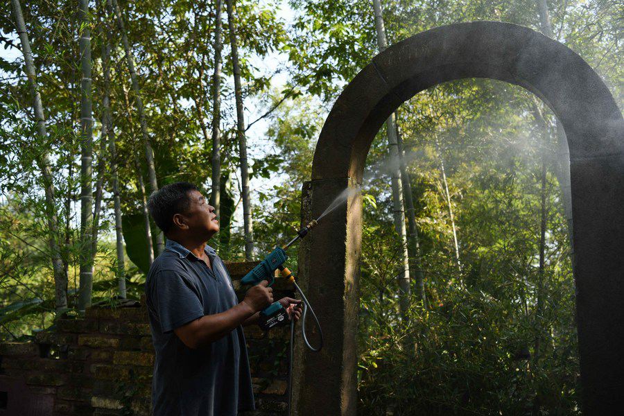 Zhang Zhengang, a former journalist and director, cleans his garden at Shiji Village of Yansi Township, Huangshan City in east China's Anhui Province, Sept. 16, 2021. (Xinhua/Zhang Duan)