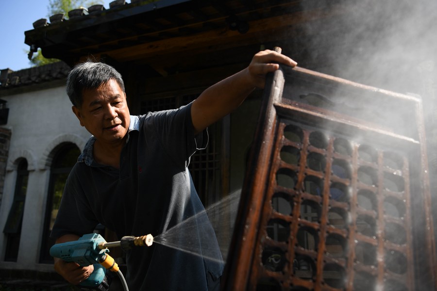 Zhang Zhengang, a former journalist and director, cleans a wooden window he collected at Shiji Village of Yansi Township, Huangshan City in east China's Anhui Province, Sept. 16, 2021. (Xinhua/Zhang Duan)