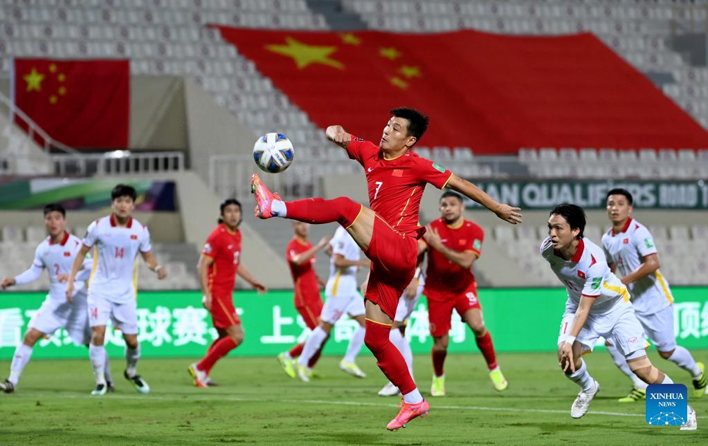 Wu Lei (front) of China competes during the FIFA World Cup Qatar 2022 Asian qualification football match between China and Vietnam in Sharjah, the United Arab Emirates, Oct. 7, 2021. (Xinhua)