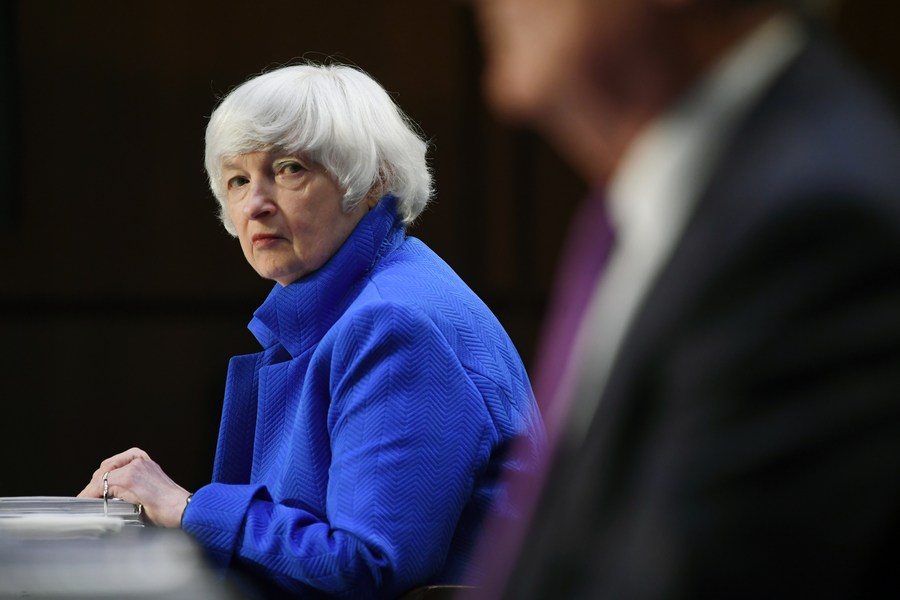 U.S. Treasury Secretary Janet Yellen testifies during a Senate Banking, Housing, and Urban Affairs Committee hearing in Washington, D.C., the United States, on Sept. 28, 2021. (Matt McClain/Pool via Xinhua)