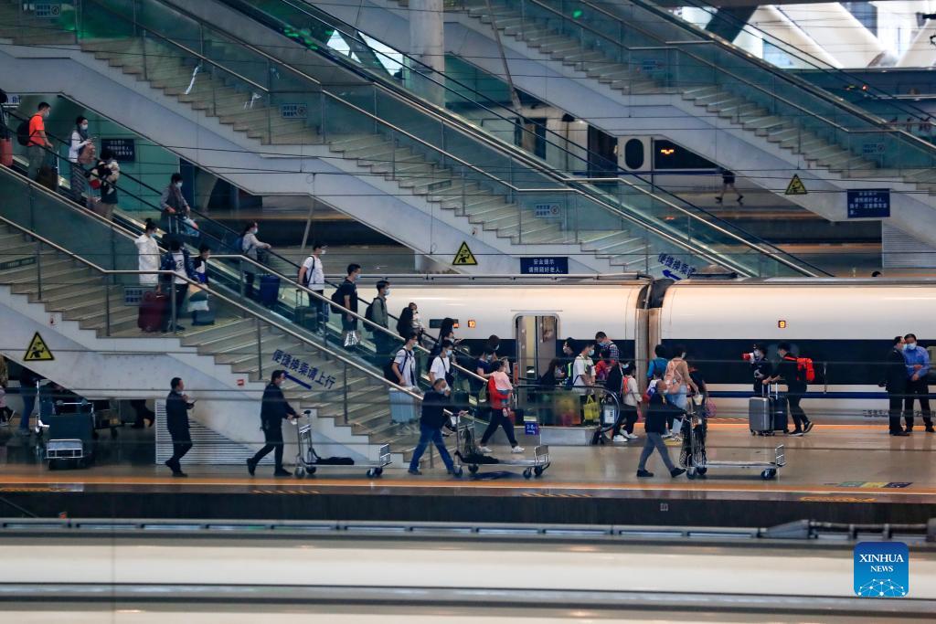Passengers are about to board the train at the Wuhan railway station in Wuhan, central China's Hubei Province, Oct. 7, 2021. Transportation hubs across China are witnessing the peak of return passengers as the week-long holiday draws to an end on Thursday. (Photo by Zhao Jun/Xinhua)